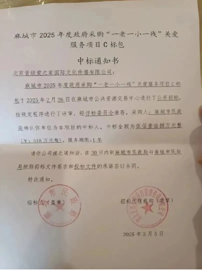 此次中标项目,是麻城市民政局面向社会公开招标的重点民生工程,当地社会救助资金规模超4亿元,其中5%专项用于 “一老一小” 等群体关爱服务。晋级集团凭借严谨方案与务实报价,从竞争中脱颖而出,顺利拿下这一重要项目。这一突破,标志着晋级从以往纯市场化运营模式,正式迈入政策与市场双轮驱动的全新发展阶段,让全国托管行业看到了政策扶持下的新赛道、新机遇。