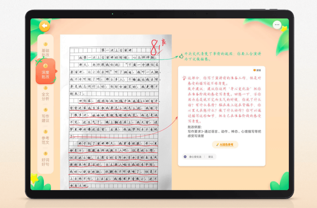 写作方面,好作文高分的关键在于真情实感,而非死记硬背模板。T90系列的AI写作辅导通过1对1对话唤醒孩子的真实生活体验,基于每个孩子的独特经历生成个性化提纲;写后依据单元要求针对性批改,像真人老师一样引导孩子完善。作文AI一对一辅导,让真情自然流露。