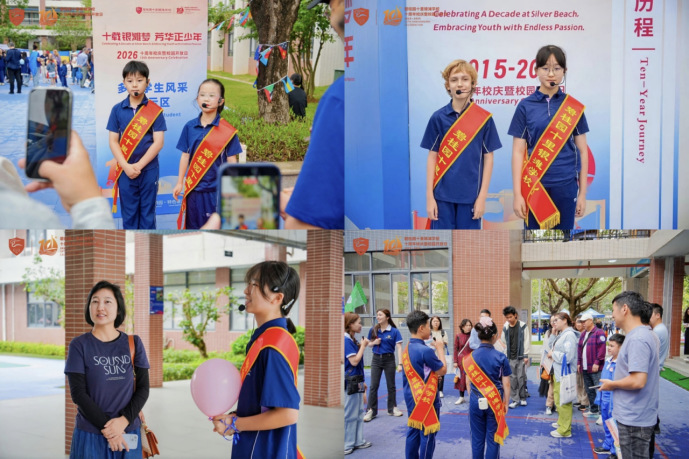 校园内多个展区全面开放,由双语金牌小讲解员带队导览,生动呈现学校十年办学历程与育人成果,成为校庆一道亮丽风景。小小解说员自信大方,用流利的中英文为来宾讲述每一段银滩记忆。