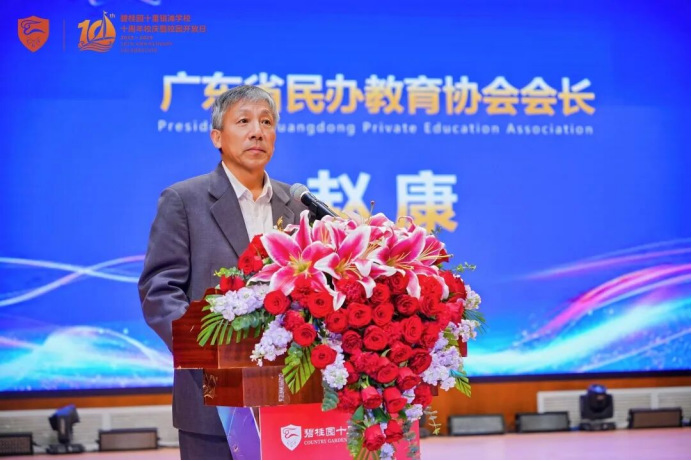 他代表协会祝贺学校建校十周年,高度肯定其“个性化教育”理念和融合国家根基与国际视野的办学特色。他提出四点期望:坚持党建引领、加强内涵建设、强化师资队伍、落实五育并举,希望学校继续为广东民办教育高质量发展贡献力量。