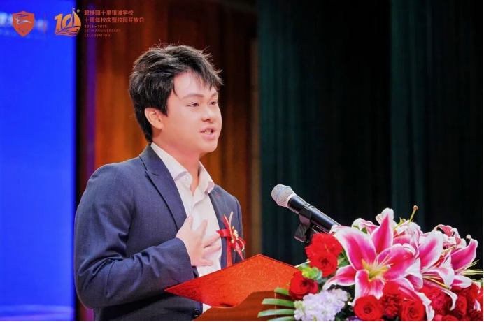 他深情回忆在银滩学校的成长点滴,感恩母校和老师们的善良与教导。他以“育苗”比喻师生关系,传达学校给予的底气与温暖。他勉励学弟学妹不负韶华,做有担当、有温度的人,并祝愿母校桃李满天下。